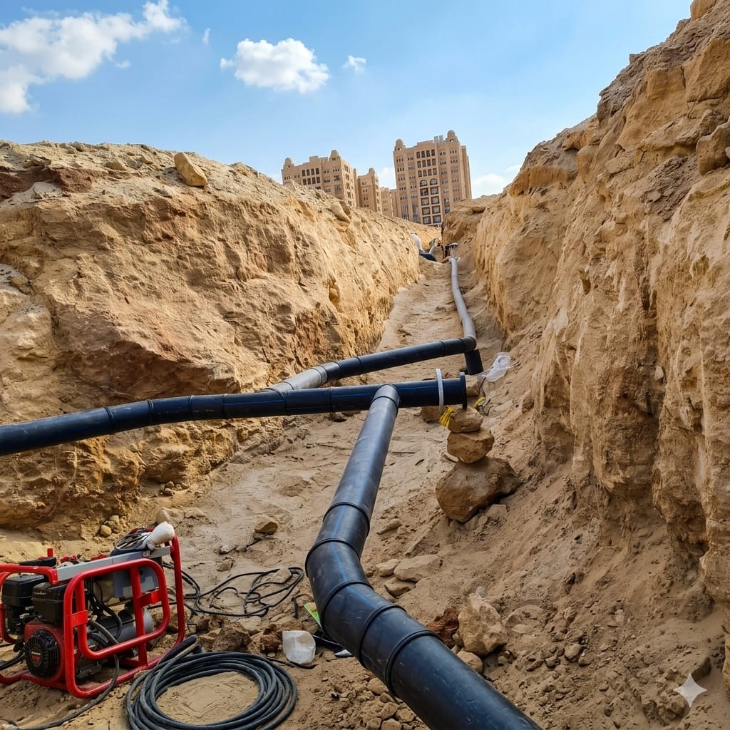 مؤسسة خالد سعيد للبنية التحتية تقدم خدمات متكاملة في تنفيذ مشاريع الطرق، شبكات المياه، الصرف الصحي، وأعمال لحامات البولى ايثلين HDPE عالى الكثافه وتاجير مكن اللحام.
